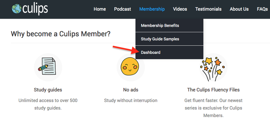 You can search, organize, and download our entire library of audio lessons and study guides. Plus, the Dashboard is the place where you can access exclusive content only for Culips Members, like the Culips Fluency Files